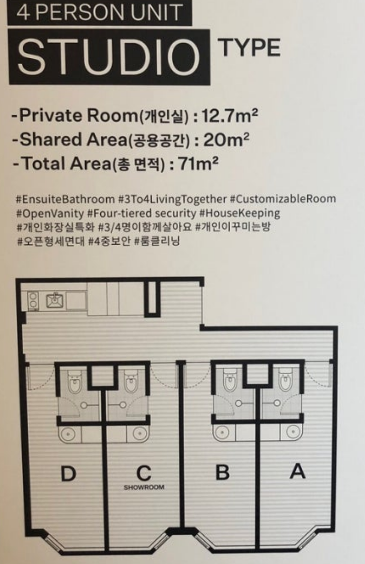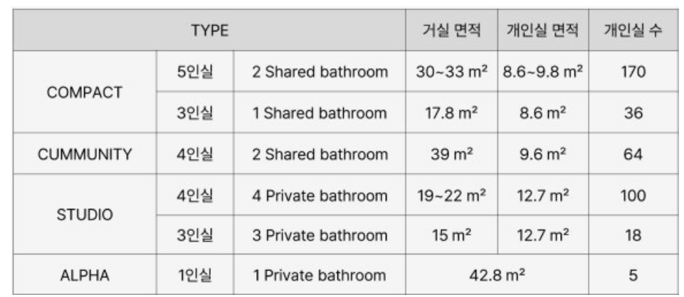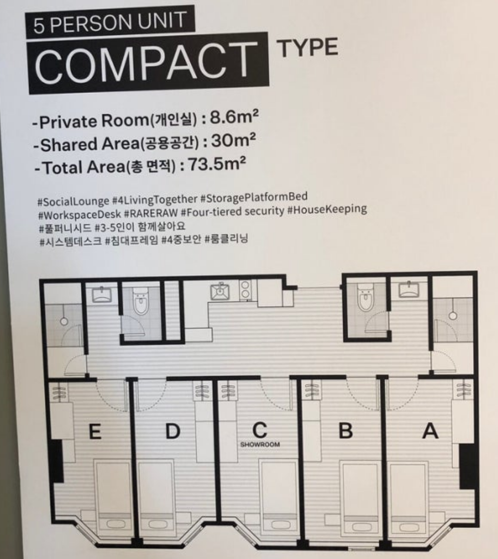 보증금 500에 월세 100은 방은 개별이고 화장실, 샤워실, 부엌을 공유하는 방식이다. 5인이 공유하는 기준이라 좀 불편할 수도 있다.